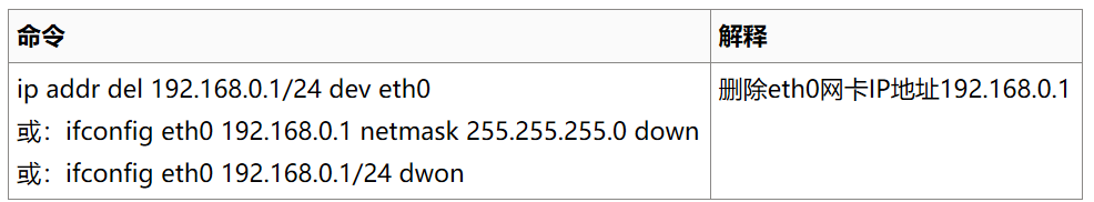 此命令用于删除ip地址。与ip addr add的参数一致。设备名称是必需的参数。其余的是可选的。如果没有给出参数,则删除第一个地址。
