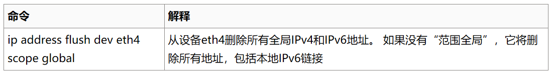 此命令用于删除ip地址。与ip addr add的参数一致。设备名称是必需的参数。其余的是可选的。如果没有给出参数,则删除第一个地址。