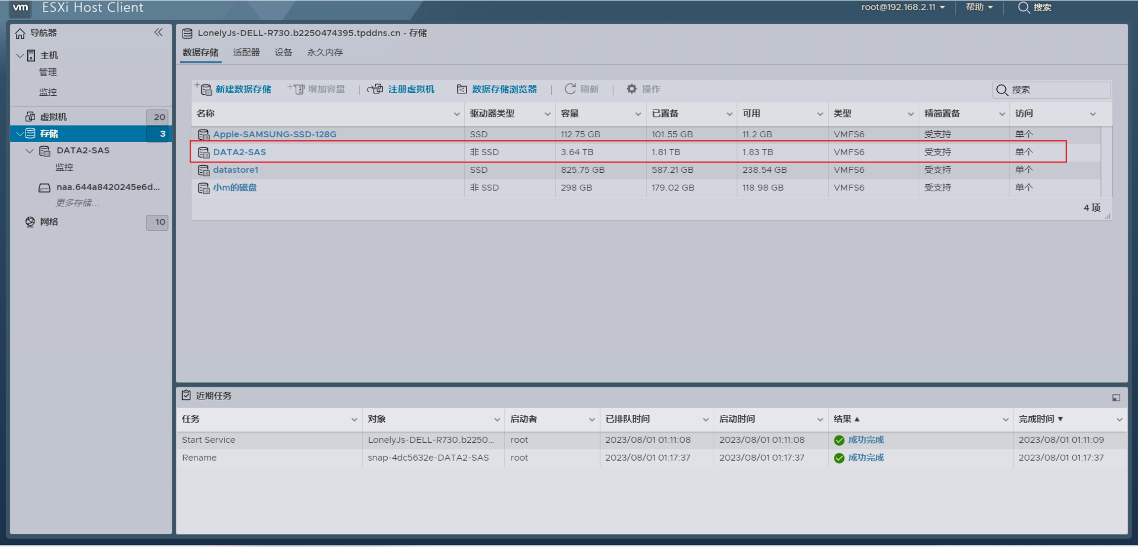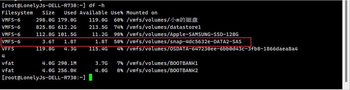 3. df -h 查看挂载情况,我这里经过系统自动重命名之后叫snap-4dc5632e-DATA2-SAS,我的原名叫DATA2-SAS